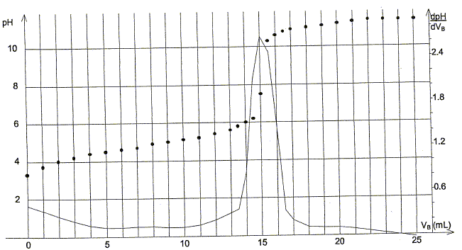 Concentration molaire en soluté apporté cA de la solution S : A l'équivalence, les quantités de matière des réactifs mis en présence sont en proportions stoechiométriques. cAVA = cBVE ; cA= cBVE /VA = 1,0 10-2 * 15/10 ; cA= 1,5 10-2 mol/L. Masse molaire de l'acide carboxylique utilisé pour réaliser la solution S : 1,5 10-2 mol dans 1 l corresponde à 0,90 g de soluté ; 1 mol correspond à 0,90/1,5 10-2 = 90/1,5 = 60 g/mol. L'acide utilisé est l'acide éthanoïque CH3-COOH.
