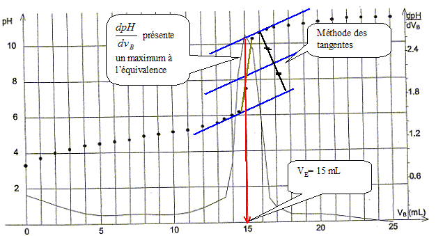 Equation de la réaction support du dosage : R-COOH(aq) + HO-(aq) = R-COO-(aq) + H2O. Volume équivalent VE de ce dosage :
