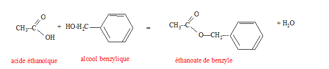 Rendement de cette synthèse : D'après les nombres stoechiométriques de l'équation, à partir de 2,0 10-1 mol d'alcool et 2,0 10-1 mol d'acide on peut obtenir au mieux 2,0 10-1 mol d'ester. rendement = quantité réelle / quantité théorique = 1,3 / 2 = 0,65 (65 %). On peut améliorer le rendement en utilisant un réactif en excès, ou en éliminant le produit le plus volatil ( l'eau dans ce cas) au fur et à mesure qu'il se forme. On peut aussi remplacer l'acide carboxylique par l'anhydride d'acide correspondante ( anhydride éthanoïque). |