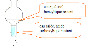 L'ester étant très peu solule dans l'eau salée, se trouve dans la phase organique. La densité de celle-ci, voisine de 1,05, est inférieure à celle de l'eau salée ( 1,20). Dans l'ampoule à décanter la phase la plus dense occupe la partie inférieure.