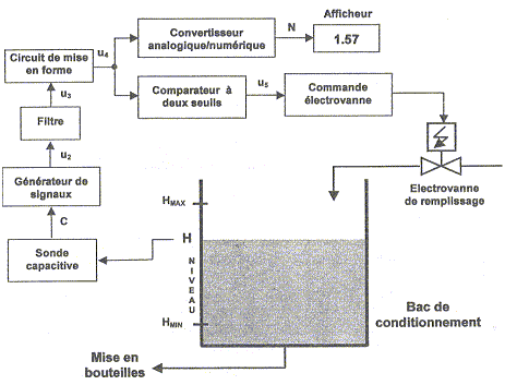 Le dispositif proposé ici effectue la mesure et le contrôle de niveau de boisson lactée dans un bac de conditionnement. Une sonde dite capacitive est employée pour la mesure du niveau du fluide. Un afficheur renseigne en permanence les opérateurs sur le niveau du réservoir. Lorsque le niveau descend en dessous d'un certain seuil, la vanne d'arrivée de produit s'ouvre pour le remplissage du bac.