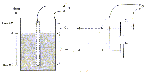 10Hmax. On souhaite que C = 600 H + 1200 avec C en pF et H en mètres. Pour obtenir ce résultat, il faut ajouter un condensateur de capacité fixe Cf en parallèle sur C. Valeur de Cf : Les capacités des condensateurs montés en parallèle s'ajoutent : 600 H + 20 +Cf = 600 H + 1200 Cf = 1180 pF. Plage de variation de C correspondante à une variation de niveau H allant de 0 à 2 mètres. C = 600 H + 1200 Pour H=0 : Cmini = 1200 pF. Pour H=2 m : Cmini = 2400 pF.