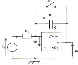linéaire du fait de la contre réaction entre la sortie et l'entrée inverseuse et de l'absence de liaison entre la sortie et l'entrée non inverseuse La valeur de vD1 est nulle en mode linèaire. Relation entre les tension u1 et uC : L'entrée non inverseue est reliée à la masse et vD1 est nulle : u1 + uC = 0 ; u1 = - uC. Si l'interrupteur K est fermé la tension uC et en conséquence la tension u1 sont nulles. À t = 0, K s'ouvre. On considère que