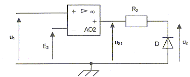 Dans le cas du montage comparateur, la tension de sortie uS1 dépend du signe de de la différence u1-E2. si u1 > E2 , u1-E2est positive : alors uS1 = + 12 V. Dans ce cas la diode est non passante ; l'intensité est nulle dans R2 et en conséquence u2 = uS1 = + 12 V. si u1< E2 , u1-E2est négative : alors uS1 = - 12 V. Dans ce cas la diode est passante ; la tension à ces bornes est nulle ( diode parfaite) u2 =0 V.