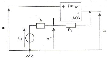 Relation simple entre les tensions u3 et v- : En régime linéaire les deux entrées de l'A.O sont au même potentiel ( e=0) u3 = v-. Tension de sortie u4 : On note i l'intensité qui travers R4 et R5. E3 = v-+R4 i soit i = (E3 -v-) /R4 v- = u4 + R5 i = u4 +R5 (E3 -v-) /R4 v- (1+R5 /R4 ) = u4 +R5 E3/R4 u4 =v- (1+R5 /R4 ) -R5 E3/R4 ; u4 =u3 (1+R5 /R4 ) -R5 E3/R4 . Valeurs à donner à R5 et E3 pour que l'expression précédente devienne : u4 = 4× u3 - 12 : D'une part : 1+R5 /R4 = 4 ; R5 /R4 =3 ; R5 = 3 kW. D'autre part : R5 E3/R4 = 12 ; 3E3 = 12 ; E3 = 4 V.
