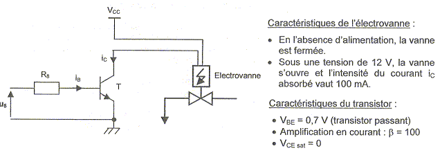 Si le transistor T est à l'état saturé : VCEsat = 0 et l'électrovanne est soumise à la tension VCC= 12 V : elle est donc ouverte. Valeur de l'intensité du courant iC : iC = 100mA =