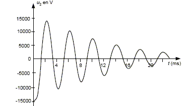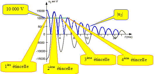 Qualifier le régime observé et expliquer pourquoi l'amplitude de la tension u2(t) décroît au cours du temps. Expliquer, grâce à la courbe précédente, pourquoi en présence du condensateur il y a un " train d'étincelles " aux bornes de la bougie plutôt qu'une étincelle unique. Réponse : Le régime observé est pseudopériodique. Lors des échanges d'énergie entre condensateur et bobine, une partie de l'énergie est perdue sous forme de chaleur ( effet joule) dans la résistance r ( amortissement). L'amplitude de la tension u2 diminue au cours du temps. "Cette étincelle apparaît lorsque la valeur absolue de la tension aux bornes de la bougie est supérieure à 10 000 volts". En présence du condensateur il y a un " train d'étincelles " aux bornes de la bougie :