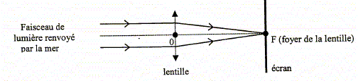 Dans quel cas deux couleurs sont-elles complémentaires l'une de l'autre ? Le mélange de deux couleurs dites " complémentaires" donne du blanc. Il est écrit dans le texte que l'eau liquide a une préférence pour le rouge. A partir de cette affirmation expliquer pourquoi la mer apparaît noire lorsqu"elle est éclairée par la lumière rouge d'un coucher de soleil ? La lumière émise par le soleil couchant contient essentiellement du rouge : le bleu-vert ont quasiment disparu. Or la mer absorbe la plus grande partie de la lumière rouge qu'elle reçoit : en conséquence elle ne diffuse pratiquement aucune lumière et paraît noire. Le trajet d'un faisceau de lumière renvoyé par la mer pénètre dans l'oeil selon le schéma suivant :