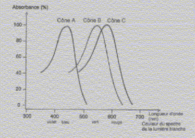 Variation de l'absorbance, en fonction des longueurs d'onde de la lumière blanche, pour les trois types de cônes présents dans la rétine humaine. Source Physiologie des animaux, tome 2 Nathan, p 155, modifié.