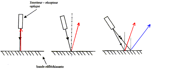 La figure ci-dessus représente le chemin d'un rayon lumineux incident lorsque l'axe optique du détecteur est normal au plan de la bande réfléchissante.