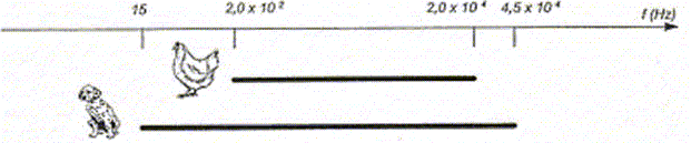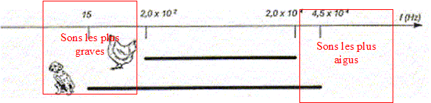 Dans un milieu dispersif, la célérité des ondes dépend de leurs fréquences. La poule ne perçoit que les sons de fréquences comprises entre 200 et 20 000 Hz. Le chien perçoit les sons dont les fréqences sont comprises entre 15 Hz et 45 000 Hz. Le chien perçoit des sons plus graves ( 15 Hz ) que ceux perçus par la poule. Le chien perçoit des sons plus aigus (45 000 Hz) que ceux perçus par la poule.