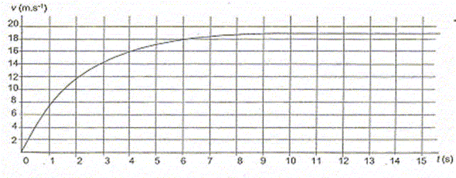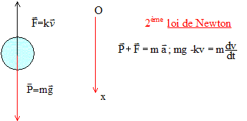 Equation différentielle qui régit l'évolution de la valeur v de la vitesse du grêlon : mdv/dt + kv = mg (1) Expression de la valeur v lim de la vitesse limite de chute : Lorsque la vitesse limite est atteinte, le mouvement devient rectiligne uniforme et dv/dt est nulle : (1) s'écrit : v lim = mg/k. Détermination graphique de la valeur v lim de sa vitesse limite de chute : la figure 1 donne vlim = 19 m/s. Valeur de k correspondant à cette vitesse limite dans le cadre de ce modèle : v lim = mg/k donne k = mg/vlim = 3,8 10-3 * 9,8 / 19 = 1,96 10-3 kg s-1 ( réponse : k = 2,0 10-3 kg s-1 ) Durée Dt au bout de laquelle la vitesse atteinte est égale à 95 % de la vitesse limite : 0,95*19 = 18 m/s