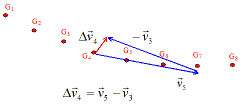 G2G3=1,6 cm ; G3G4=1,7 cm ; G4G5=1,8 cm ; G5G6= 1,8 cm. Valeurs v3 et v5 des vecteurs vitesses aux points G3 et G5 : v3 = (G2G3+G3G4)/ (2t) = (16+17)/ (2*30) = 33/60 = 0,55 m/s. v5 = (G4G5+G5G6)/ (2t)=(18+18)/ (2*30) = 36 /60 = 0,60 m/s. Représentation de ces vecteurs ( 1 cm <--> 0,1 m/s): Les vecteurs vitesses sont portés par la tangente la trajectoire au point considéré ; le sens est celui du mouvement.
