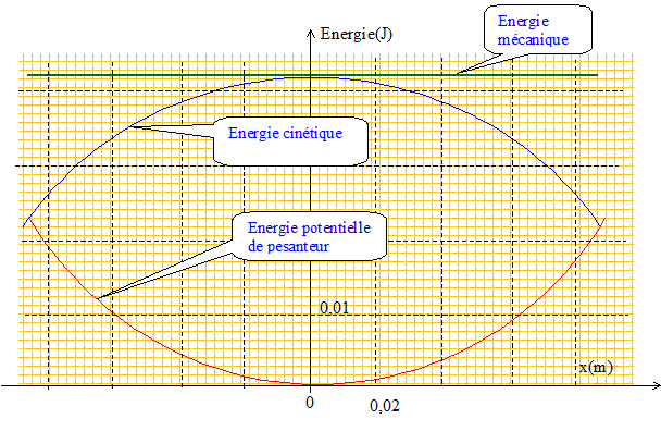Valeur de la vitesse maximale du pendule : Le graphe indique que l'énergie mécanique est égale à 0,042 J Au passage à la position d'équilibre G0, l'énergie mécanique est sous forme cinétique : ( vitesse maximale) 0,042 = ½mv2max ; vmax = (2*0,042/m)½ = (0,084/0,236)½ ; vmax = 0,60 m/s. Hauteur maximale atteinte par le pendule : L'énergie mécanique est sous forme potentielle de pesanteur. 0,042 = mg zmax ; zmax = 0,042/(mg) = 0,042/ (0,236*9,8) ; zmax = 0,018 m. Abscisse angulaire maximale a du pendule : 0,018 = L(1-cos amax) 1-cos amax= 0,018/L ; cos amax=1-0,018/L cos amax=1-0,018/ 0,41 =0,956 ; amax= 17 °.