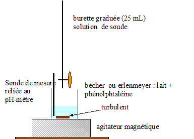 Dosage de l'acide lactique dans un lait : On introduit dans un erlenmeyer vA=20,0 mL d'un échantillon de lait et quelques gouttes de phénolphtalèine. On ajoute progressivement une solution d'hydroxyde de sodium de concentration cb= 5,0 10-2 mol/L. Le changement de couleur du milieu réactionnel est observé pour un volume de solution d'hydroxyde de sodium ajouté égal à 9,2 mL.