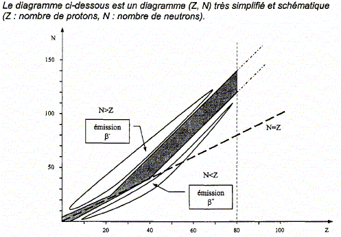 La radioactivité naturelle fut découverte en 1896 par H. Besquerel. Le signe le plus perceptible de la radioactivité est l'existence d'un rayonnement émis par les atomes de certains nucléides et dont l'origine se situe au niveau de leur noyau qui est instable. On observe ainsi, par exemple, les rayonnements ( on parle de radioactivité) b ( béta+ ou béta-), qui s'accompagnent souvent d'émission g ( gamma), radiation électromagnétique de même nature que la lumière, provenant du retour à l'état fondamental d'un noyau fils suite à la transmutation d'un noyau père radioactif. Equation de la désintégration nucléaire, diagramme (Z, N) : Parmi les trois types de radioactivité étudiés en classe, citer celle qui n'a pas été évoquée dans le texte plus haut. Donner la composition de la particule émise lors de cette radioactivité.