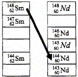 Parmi les trois types de radioactivité étudiés en classe, la radioactivité de type a n'a pas été évoquée dans le texte plus haut. La particule émise lors de cette radioactivité est un noyau d'helium 42He ( 2 protons et 4-2 = 2 neutrons). La zone grisée du diagramme représente la "vallée de la stabilité ", ensemble des noyaux stables. Soit la réaction nucléaire de transmutation indiquée par la flèche ci-dessus : 14862 Sm---> 14460 Nd + AZX Conservation du nombre de nucléons : 148=144+A soit A=4. Conservation de la charge : 62 = 60 + Z soit Z=2 ; donc élément hélium La particule émise est un noyau d'hélium 42He : la radioactivité de type a.