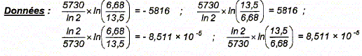 La loi de décroissance radioactive peut également s'écrire en fonction de l'activité , A(t) =A0 exp (-lt), dans laquelle A0 est l'activité à la date t=0 et A l'activité mesurée à l'instant t. Le prélèvement d'une poutre en bois dans une tombe au Sahara fournit une activité au moment de la mesure telle que A= 6,68 désintégrations par minute et par gramme de carbone alors que A0 = 13,5 désintégrations par minute et par gramme de carbone. Démontrer que l'expression qui permet de donner l'âge de la mort d'un organisme s'écrit : t = t½ / ln 2 * ln(A0/A) avec t½ = 5730 ans. Calculer en faisant apparaître l'application numérique, l'âge t de la tombe de ce vizir de la première dynastie des pharaons.
