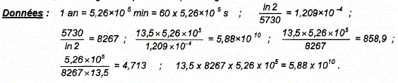 /t½. ln 2 est sans dimension ; t½ a la dimension d'un temps donc [ln2 /t½] = T-1. La constante radioactive est l'inverse d'un temps. Montrons que l'activité A à l'instant t et le nombre N de noyaux présents dans l'échantillon à la date t sont liés par la relation : A = l N. A = - dN/dt avec N = N0 exp (-lt) dN/dt = -l N0 exp (-lt) = - l N d'où A = l N. Calcul du nombre N d'atomes de carbone 14 dans 1 g de carbone tel que A= 13,5 désintégrations par minute et par gramme de carbone : N = A/l avec A = 13,5 / 60 Bq. l = ln2 /t½ ; 1/l = t½/ ln2 avec t½ = 5730 ans = 60*5,26 105 s. N= 13,5 / 60 * 5730*60*5,26 105 / ln 2 = 5730 / ln 2 *13,5*5,26 105 N=8267*13,5*5,26 105 = 5,88 1010.