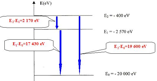 l = c / n ; n = c / l avec c : célérité ( m/s ) de l'onde ; l longueur d'onde (m) ; n : fréquence ( hz). De plus E= hn = hc/ l ; l = hc/E ; E s'exprime en joule. La plus petite longueur d'onde correspond à la plus grande valeure de l'énergie E. ( transition E2 ---> E0 ) E = 19 600 * 1,6 10-19 = 3,136 10-15 J. l = 6,62 10-34*3,00 108 / 3,136 10-15 ; l =6,3 10-11 m.