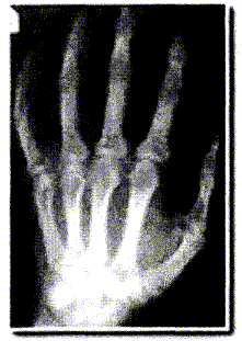 La radiographie enregistre l'image d'un corps traversé par un faisceau de rayons X. Suivant la constitution du corps, les rayons X sont plus ou moins absorbés et le film photographique, placé derrière le corps radiographié, est ainsi plus ou moins impressionné. Le document ci-dessous correspond à la radiographie d'une main. La main placée contre la plaque sensible s'intercale entre la source de rayons X et la plaque.