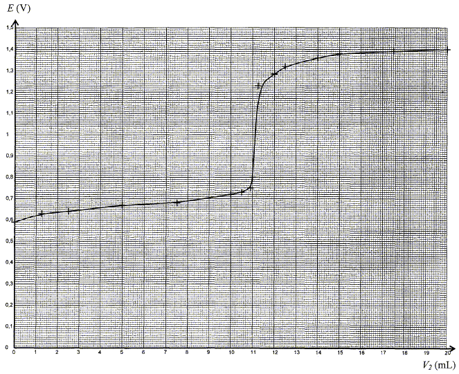 On souhaite déterminer la concentration c1 en ion fer (II) Fe2+ de la solution S' par titrage potentiométrique. Pour cela, on prélève un volume V1 = 10,0 mL de la solution S' dans laquelle on plonge une électrode de mesure et une électrode de référence. La solution titrante utilisée est une solution acidifiée de sulfate de cérium IV (Ce4+ + 2SO42- ) de concentration c2 = 0,100 mol/L. On note V2 le volume de solution titrante versée et E le potentiel de l'électrode de mesure donné par rapport à l'électrode standard à hydrogène.