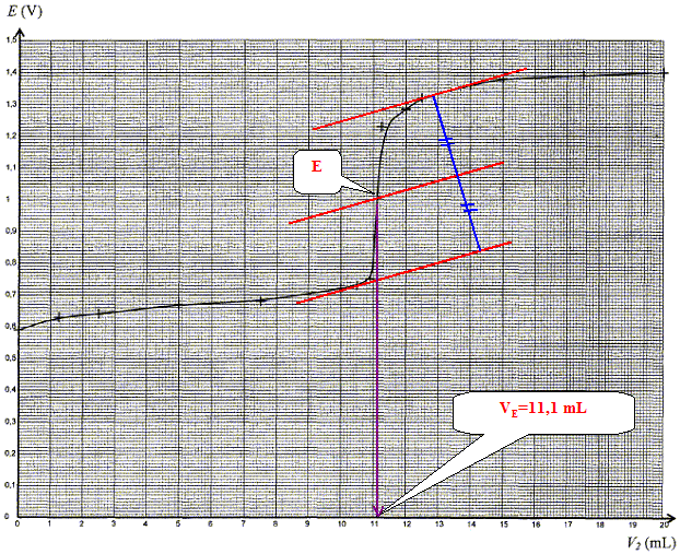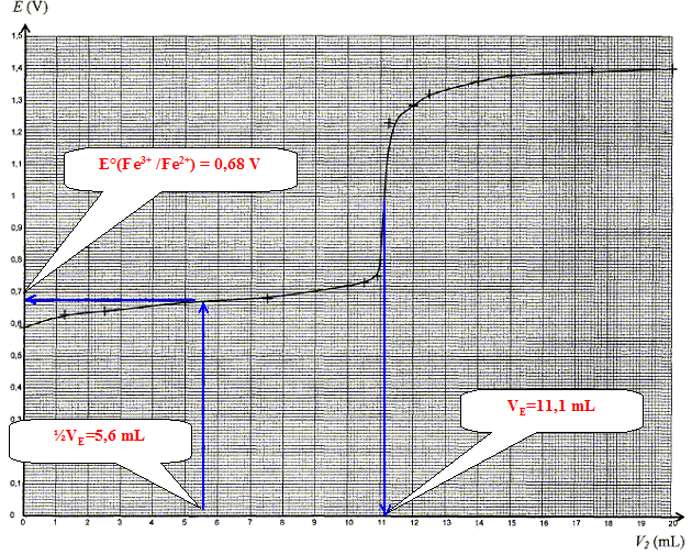 - Ecrire la demi-équation électronique relative au couple Fe3+ / Fe2+ puis donner l'expression littérale du potentiel d'électrode du couple Fe3+ / Fe2+. - Etablir la relation entre les concentrations [Fe2+] et [Fe3+] à la demi équivalence c'est à dire pour V=½VE. - Donner l'expression littérale du potentiel d'électrode du couple Fe3+ / Fe2+ à la demi équivalence. - Déterminer graphiquement la valeur du potentiel standard du couple Fe3+ / Fe2+ et comparer avec la valeur théorique ( 0,68 V). Réponse : Fe2+ = Fe3+ + e- E = E°(Fe3+/Fe2+) + RT/F ln ([Fe3+]/[Fe2+]) Quantité de matière initiale d'ion Fe2+ : n(Fe2+)0= c1 V1 ; c1 V1=c2 VE ; n(Fe2+)0=c2 VE Quantité de matière d'ion Fe2+ restant à la demi équivalence : n(Fe2+)½VE= ½c1 V1 ; n(Fe2+)½VE= ½c2 VE Quand une mole d'ion fer II disparaît, il se forme une mole d'ion fer III. Quantité de matière d'ion Fe3+ formé à la demi équivalence : n(Fe3+)½VE= ½c2 VE = n(Fe2+)½VE. En conséquence ln ([Fe3+]/[Fe2+]) = ln 1 = 0 et le potentiel d'électrode du couple Fe3+ / Fe2+ vaut : E°(Fe3+/Fe2+)