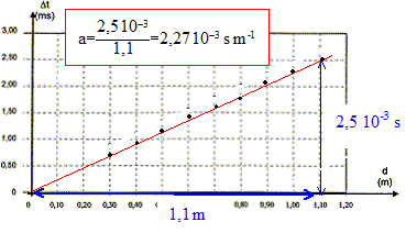 Il est nécessaire de déclencher l'acquisition lorsqu'un signal est reçu sur l'entrée B : Les ondes ultrasonores se propagent plus vite dans l'eau de mer que dans l'air : l'entrée B reçoit en premier un signal, puis ensuite l'entrée A. Expression du retard Dt entre la réception des ultrasons par les deux récepteurs en fonction de tA et tB: Dans l'air : d = vair tA. (1) dans l'eau : d = veau tB. (2) (1) - (2) donne : tA-tB = Dt = d ( 1/vair - 1/veau). vairet veau étant constantes, Dt et d sont proportionnelles : Dt = a d avec "a " une constante égale à : a = ( 1/vair - 1/veau). Le graphe correspondant Dt = f(d) est une droite passant par l'origine.