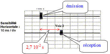 Le sondeur émet des salves d'ultrasons à intervalles de temps égaux, on mesure à l'aide d'un oscilloscope la durée Dt séparant l'émission de la salve de la réception de son écho. L'oscillogramme ci-dessous montre l'écran d'un oscilloscope lorsque le bateau se trouve en A (xA = 0 m). L'une des voies représente le signal émis, l'autre le signal reçu par le récepteur. Sur l'oscillogramme, on a décalé la voie 2 vers le bas pour distinguer nettement les deux signaux.