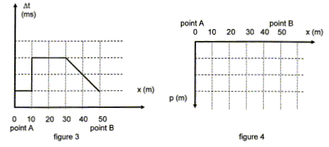 L'émission a lieu avant la réception de l'écho. Durée Dt entre l'émission de la salve et la réception de son écho : 2,7 10-2 s. Graduation de l'axe des ordonnées de la figure 3 : Une division correspond à 2,7 10-2 s. Relation permettant de calculer la profondeur p en fonction de Dt et veau : aller + retour = 2 p = veau Dt p = ½ veau Dt = 0,5*1500 * 2,7 10-2 = 20 m. Allure du fond marin exploré en précisant la profondeur p en mètres en fonction de la position x du bateau :