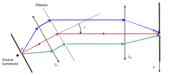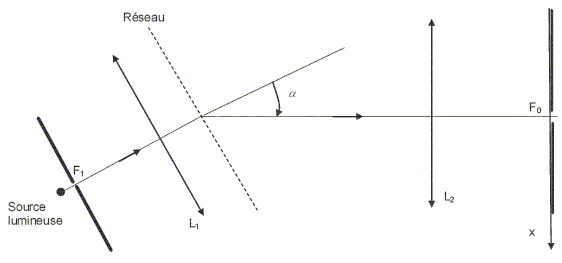Etude du monochromateur : Un monochromateur comporte une fente source, deux miroirs concaves ( assimilés dans cet exercice à deux lentilles minces L1 et L2) et un réseau. Ce réseau comporte n= 1020 traits par millimètre. La lentille L1 a pour distance focale f'1 = 20,0 cm. Une lentille L2, de distance focale f'2 = 20,0 cm, est placée derrière le réseau, son axe principal faisant un angle a avec la normale au réseau. On place au foyer image F'2 de L2 une fente F0 centrée sur cet axe dans le plan focal image. On note i0 l'angle d'incidence sur le réseau, i' l'angle d'émergence. Les angles sont orientés de la normale du réseau vers le rayon. Etablir la relation du réseau liant i0, i', l'ordre de diffraction k, n et l longueur d'onde de la lumière utilisée..