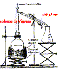 Composition des premières gouttes récupérées au cours de la distillation : espèce la plus volatile, l'ester M ( Tébullition = 31,5°C) La température en tête de colonne est 31,5°C. La température reste constante tant que la nature du produit qui s'écoule ne change pas. On détermine expérimentalement la fin de la réaction lorsque la température s'élève. Un tel dispositif expérimental permet d'améliorer le rendement d'une réaction d'estérification ( éliminer l'ester ou l'eau au fur et à mesure où il se forme) dans la mesure où l'ester ou bien l'eau sont plus volatils que les ractifs. |