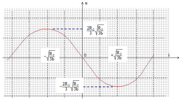 Pour tenir compte des non linéarités du montage, la caractéristique u=f(i) du dipole AB, réalisé avec l'amplificateur opérationnel, est modélisée par une courbe d'équation unique de la forme u= -R0i + b i3. Etude de cette fonction : u= -R0i + b i3. La dérivée du/di = -R0 + 3 bi2 s'annule pour les valeurs i1 = [ R0/(3b)]½ et i2 = - [ R0/(3b)]½ u présente donc deux extrémums pour i = i1 et i = i2. La dérivée est négative sur l'intervalle [i2 ; i1] : la fonction u est décroissante sur cette intervalle. La fonction u étant impaire, l'origine est centre de symétrie.