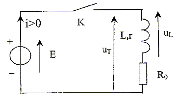 Etude du circuit électrique permettant la modélisation : On considère le circuit suivant, constitué d'une bobine d'inductance L et de résistance r en série avec une résistance réglable R0 et un interrupteur K, alimenté par un générateur idéal de fem E. A l'instant t=0 on ferme l'interrupteur K.