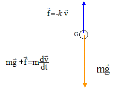 Etude de la chute d'une balle soumise à des forces de frottements : On considère une balle de masse m ; cette balle est abandonnée dans l'air à l'instant t=0, sans vitesse initiale d'un point situé à une hauteur h au dessus du sol. On assimile les frottements à une seule force f = -kv. Bilan des forces subies par la balle en faisant un schéma. ( on négligera la poussée d'Archimède).