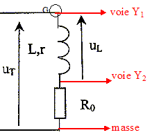 Branchements d'un oscilloscope permettant de visualiser la tension totale UT aux bornes du dipôle (L, r, R0) sur la voie Y1 et l'intensité i(t) du courant dans le circuit sur la voie Y2 :
