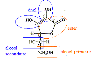 L'hydrogène du groupe énol ( carbone 4) correspond au premier équilibre acido-basique : cet hydrogène est d'autant plus acide que l'ion énolate, la base conjuguée, est stabilisée par résonance. pH de la solution initiale : C6H8O6 +H2O= C6H7O6 - + H3O+ ; Ka1= [H3O+][C6H7O6 -] / [C6H8O6 ] solution électriquement neutre : [H3O+]=[C6H7O6 -] acide peu dissocié : [C6H8O6 ] voisin de c. d'où [H3O+]2 = Ka1c ; 2 log [H3O+] = log Ka1 + log c ; pH= ½( pKa1 +logc) = 0,5( -log (6,8 10-5) - log0,1) ; pH= 2,6. Volume de soude requis pour atteindre l'équivalence : HO- + C6H8O6=C6H7O6 - +Na+. à l'équivalence CaVa = CbVb ; Vb = CaVa =/ Cb =0,1*50/0,2 = 25 mL. pH de la solution après addition de 12,5 mL de soude : Dosage base forte acide faible : à la demi-équivalence le pH est égal à pKa1 soit : -log (6,8 10-5) ; pH= 4,2. pH à l'équivalence : solution d'ascorbate de sodium C6H7O6 - + Na+. [C6H8O6 ] négligeable devant [C6H7O6 -] : [C6H7O6 -] voisin de CaVa /(Va+Vb). solution électriquement neutre : [H3O+] + [Na+] =[HO-]+[C6H7O6 -] [Na+] = CbVb /(Va+Vb) = CaVa /(Va+Vb) ; hypothèse d'un milieu basique [H3O+] négligeable devant [HO-] [Na+] =[HO-]+[C6H7O6 -] conservation du carbone : [C6H7O6 -] + [C6H8O6 ] = CaVa /(Va+Vb) = [Na+] ces deux dernières relations donnent : [C6H8O6 ] =[HO-] = Ke/[H3O+]. or Ka1= [H3O+][C6H7O6 -] / [C6H8O6 ] = [H3O+]2 CaVa /((Va+Vb)Ke) [H3O+]2 =Ka1(Va+Vb)Ke/( CaVa ) = 6,8 10-5*75*10-14 / (0,1*50)= 10-17. [H3O+]=3,2 10-9 ; pH = 8,5. ( l'hypothèse du milieu basique est confirmée) pH de la solution après addition de 26 mL de soude : 1 mL de plus q'à la 1ère équivalence. C6H7O6 - +H2O = C6H6O6 2- + H3O+ ; Ka2 = [C6H6O6 2- ][ H3O+]/[C6H7O6 -] [ H3O+]= Ka2[C6H7O6 -] / [C6H6O6 2- ] C6H7O6 - +HO- = C6H6O6 2- +H2O.