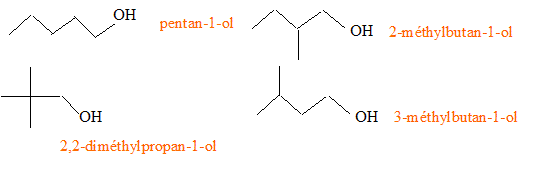 12x / 68,2 = y / 13,6 = 16 / 18,2 = M /100 d'où M= 16*100/18,2 = 88 g/mol x= 0,88*68,2/12 = 5 ; y=0,88*13,2 = 12 C5H12O. Le produit organique obtenu lors de l'oxydation ménagée ne réagit ni avec la 2,4-DNPH, ni avec le réactif de Tollens : ce produit n'est ni un aldehyde, ni une cétone. Il s'agit donc d'un acide carboxylique résultant de l'oxydation ménagée d'un alcool primaire. Formule topologique de tous les isomères qui pourraient correspondre à A :