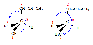 CH3-CH2-CH2-*CHOH-CH3. Un carbone asymétrique est un carbone tétragonal lié à 4 groupes différents. Dessiner les deux énantiomères en perspective et indiquer leur configuration absolue R ou S.