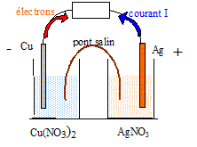 Le cuivre est le réducteur le plus fort : il s'oxyde, libère des électrons et constitue la borne négative de la pile. Cu(s) = Cu2+(aq) + 2e-. Les ions argent, l'oxydant le plus fort, se réduisent : 2Ag+(aq) + 2e- = 2 Ag (s).