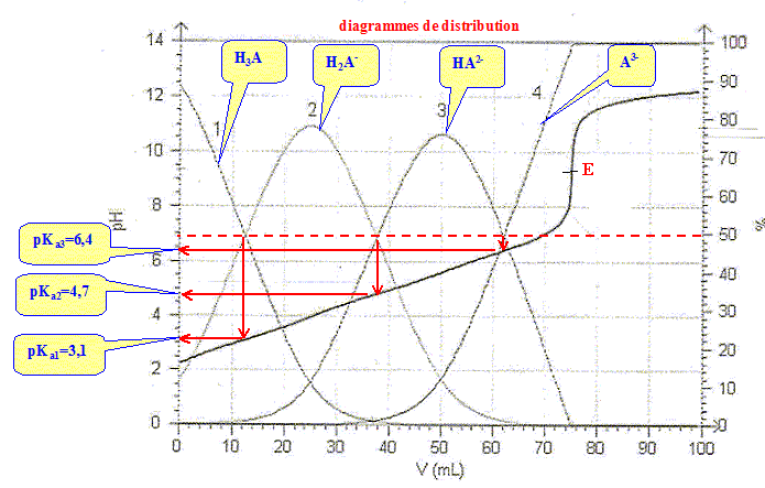 On observe un seul saut de pH car les pKa sont assez proches les uns des autres. la ( les) réaction(s) de dosage : H3A + HO- --> H2A- + H2O H2A- + HO- --> HA2- + H2O HA2- + HO- -->A3- + H2O Bilan : H3A + 3