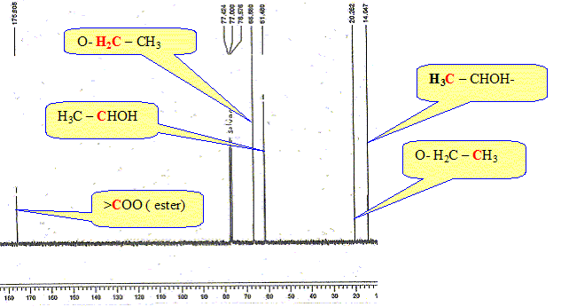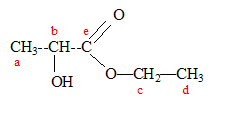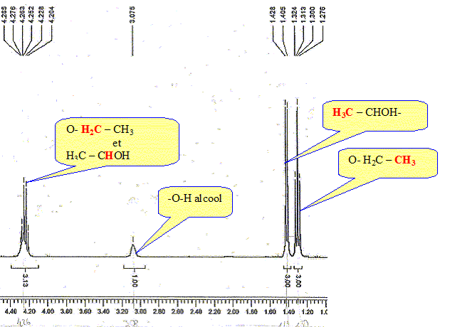 - 3 protons a : doublet ( un proche voisin, le proton b ) ; constante de couplage J= 1,428-1,405 = 0,023 - 1 proton b : quadruplet ( 3 proches voisins, les protons a ) signaux situés à : 4,276- 4,252 - 4,226 - 4,204 ; constante de couplage J= 0,023. - 3 protons d : triplet ( 2 proches voisins, les protons c ) ; constante de couplage J= 1,324-1,313= 0,011 - 2 protons c : quadruplet ( 3 proches voisins, les protons d ) ; signaux situés à : 4,285- 4,276- 4,263 - 4,252 ; constante de couplage J= 0,011.