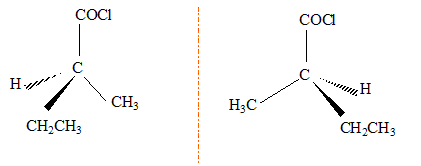 corrigé formule brute : CxHyOCl ; masse molaire M= 12 x+y+16+35,5 = 12x+y+51,5 16/ 13,3 = M/100 d'où M= 120,3 g/mol d'où 12x+y = 120,3-51,5 = 69 soit C5H9 OCl. isomères de chaîne : CH3-(CH2)3COCl : chlorure de pentanoyle. (CH3)2CH-CH2-COCl : chlorure de 3-méthylbutanoyle CH3-CH2-CH [CH3 ]-COCl : chlorure de 2-méthylbutanoyle CH3-C[CH3 ]2-COCl : chlorure de 2,2-diméthylpropanoyle A possède un carbone asymétrique : CH3-CH2-CH [CH3 ]-COCl : chlorure de 2-méthylbutanoyle
