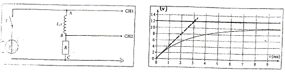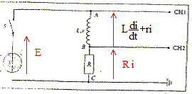 Etablissement d'un courant dans un dipole RL (5 pts) Une bobine d'inductance L et de résistance r est mise en série avec un conducteur ohmique de résistance R= 40 W. Un interrupteur S permet de connecter l'ensemble à un générateur de tension de fem E= 12,0 V. Les points A et B sont respectivement reliés aux entrées CH1 et CH2 d'un oscilloscope à mémoire, le point C étant relié à la masse. A la fermeture de l'interrupteurS, on a enregistré les tensions aux entrées CH1 et CH2, puis on a fait trracer en pointillés la tangente à la courbe exponentielle à la date t=0.