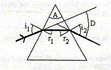 Un prisme de verre d'indice n, placé dans l'air, a pour section droite un triangle d'angle au sommet A=60°. La déviation d'un rayon monochromatique dans le prisme est repérée par l'angle de déviation D formé par le rayon incident pénétrant dans le prisme et par le rayon émergent sortant par la seconde face.