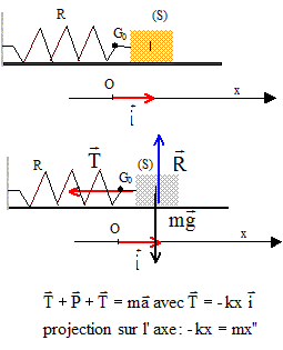 Etude théorique d'un oscillateur mécanique horizontal: Les forces s'exerçant sur le solide : Poids, verticale vers le bas, valeur mg Action du plan, verticale, vers le haut, opposée au poids. Tension du ressort, horizontale, dirigé vers O, valeur k|x|