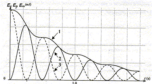 Equation différentielle du mouvement du centre d'inertie G du solide : mx"+kx=0 ; x" + k/m x=0 On pose w02=k/m ; x" +w02=0 (1) La solution générale de l'équation différentielle est de la forme x(t) =xm cos (2pt/T0+j) Expression de la période propre T0 de l'oscillateur : x'(t) = -xm2p/T0 sin (2pt/T0+j) x"(t) = -xm[2p/T0]2cos (2pt/T0+j) = -[2p/T0]2 x(t) repport dans l'équation différentielle : -[2p/T0]2 x(t) +k/m x(t) = 0 Egalité vérifiée quelque soit t si : [2p/T0]2 =k/m soit T0 = 2p[m/k]½. T0 =6,28[0,1/4]½ ; T0 =0,99 s. Homogénéité de la période : 2pest sans dimension ; [m] = M ( masse ) ; k raideur , force / longueur ; force = masse * accélération = masse * longueur / temps2 ; [k]=M T-2 ; [1/k]= M-1 T2 ; [m/k] = T2 ; [m/k] ½= T. Energie mécanique Em du système solide-ressort étudié dans une position d'abscisse x : L'énergie mécanique est la somme de l'énergie cinétique et de l'énergie potentielle élastique. L'origine de l'énergie potentielle est prise à la position d'équilibre. Em = ½kx2 + ½mv2. En absence de frottement l'énergie mécanique est constante : Lorsque x(t) = xm, la vitesse est nulle et l'énergie mécanique est sous forme d'énergie potentielle élastique. Em= ½kxm2. Etude expérimentale de oscillateur mécanique horizontal Le régime des oscillations : pseudopériodique. Le temps caractéristique T vaut T=1,0 s. (lecture graphe) A 1 % près T est égale à T0. Valeur de l'énergie mécanique à t=0 : x(0)= xm = 20 mm = 0,02 m Lorsque x(t) = xm, la vitesse est nulle et l'énergie mécanique est sous forme d'énergie potentielle élastique. Em= ½kxm2 = 0,5*4*0,022 = 8 10-4 J. Echelle en ordonnée : 1 division correspond à 2 10-4 J. Courbe 3 : énergie potentielle élastique ( à t=0, x=xm et l'énergie mécanique est sous forme potentielle élastique) courbe 2 : énergie cinétique ( à t = 0, la vitesse est nulle) courbe 1 : énergie mécanique ( somme de l'énergie potentielle et de l'énergie cinétique)