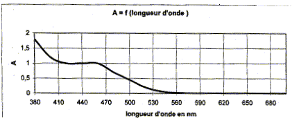 - En utilisant le graphique justifier la couleur d'une solution aqueuse de dichromate de potassium. - Quelles précautions prendre pour manipuler les cuves d'un spectrophotomètre ? - Déterminer le nombre d'oxydation du chrome dans l'ion dichromate. réponse : La solution présente une forte absorption entre 380 nm et 500 nm, dans le violet et dans le bleu. La couleur de la solution de dichromate de potassium est jaune orangée, couleur complémentaire du bleu. Pour manipuler les cuves d'un spectrophotomètre, il ne faut pas mettre les doigts sur les faces lisses : la lumière traverse ces faces. Nombre d'oxydation du chrome dans l'ion dichromate : 2 nombre d'oxydation du chrome + 7 nombre d'oxydation de l'oxyène = -2 ( charge de l'ion) Or le nombre d'oxydation de l'oxyène vaut -2 d'où : 2 nombre d'oxydation du chrome + 7 *(-2) = -2 2 nombre d'oxydation du chrome = 12 ; nombre d'oxydation du chrome = 6.