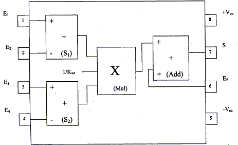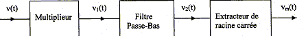 Le premier étage ( le multiplieur ) élève v(t) au carré, le deuxième étage ( le filtre passe bas) en retite la valeur moyenne, le dernier étage extrait la racine carrée. On supposera que tous les circuits intégrés utilisés sont idéaux : les intensités des courants d'entrée sont nulles ; la résistance de sortie est nulle ; les A.O fonctionnent en régime linéaire, leur tension différentielle d'entrée Ud est donc nulle. Etude du multiplieur analogique : Son shéma fonctionnel et son brochage sont donnés ; S1 et S2 effectuent chacun une soustraction, Mul effectue une multiplication avec la constante 1/Km et Add effectue une addition. . On note vE1(t), vE2(t)...vE6(t) les tensions instantanées appliquées respectivement sur les entrées E1, E2....E6 et on note vs(t) la tension de sortie S. On a ainsi : vs(t) = (1/Km) [ vE1(t)- vE2(t)] [ vE3(t)- vE4(t)] + vE6(t) On veut que la tension de sortie vs(t) soit telle que : vs(t) =k vE1(t) vE3(t). - Quelles sont les bornes d'entrée qu'il faut relier à la masse ? - Quelle relation a t-on entre k et Km ? - Calculer Km si k = 0,1 V-1.