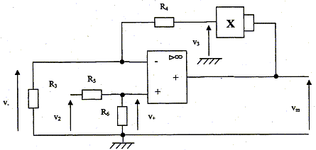réponse : v3(t) = kv2m(t). v+(t) =v-(t) ; R6 v2(t) / (R6-R5 ) = R3 v3(t) / (R3-R4 ) v3(t) = R6 (R3-R4 ) v2(t) / [ (R6-R5 ) R3]. vm(t) = 1/k½ { R6 (R3-R4 ) v2(t) / [ (R6-R5 ) R3] }½.